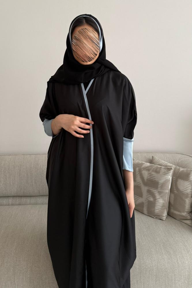 وتكتمل الإطلالة بـطرحة متناسقة بطرف سماوي بنفس درجة الأكمام، لتمنحك حضورًا أنيقًا دون تكلّف.