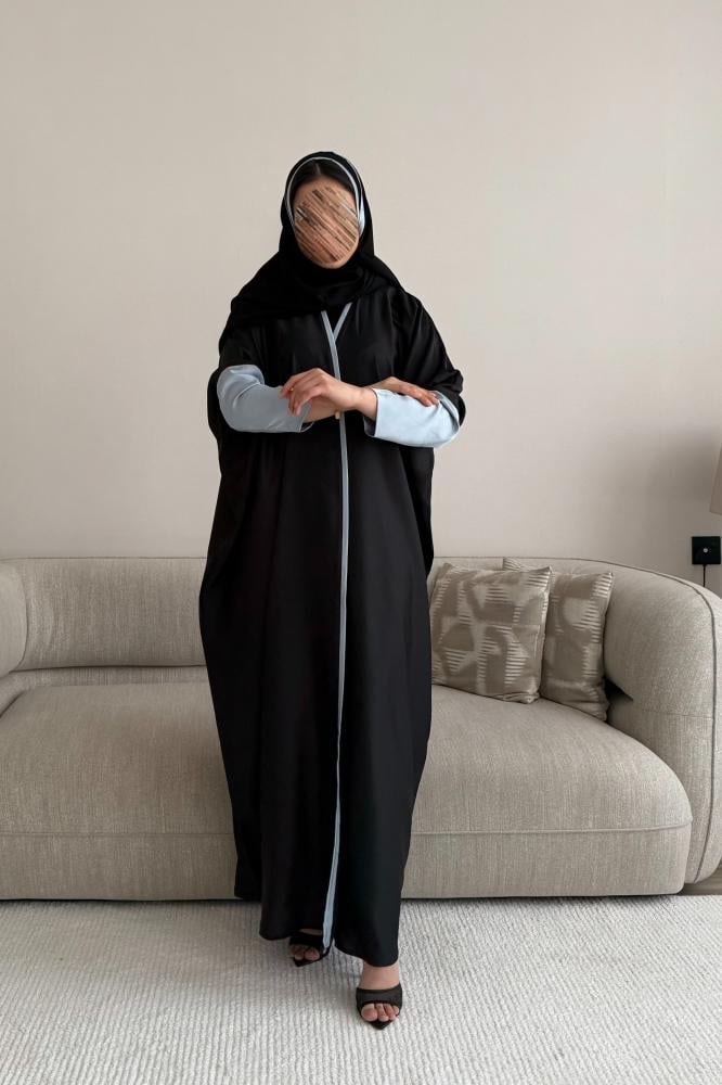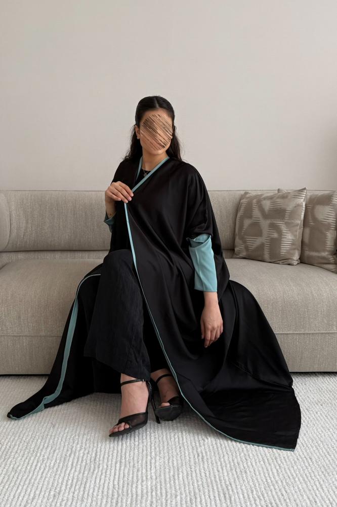 - الأكمام باللون الأزرق السماوي او لون تيفاني تضيف لمسة ناعمة وعصرية تتوازن مع اللون الأسود الأساسي.