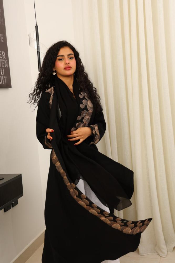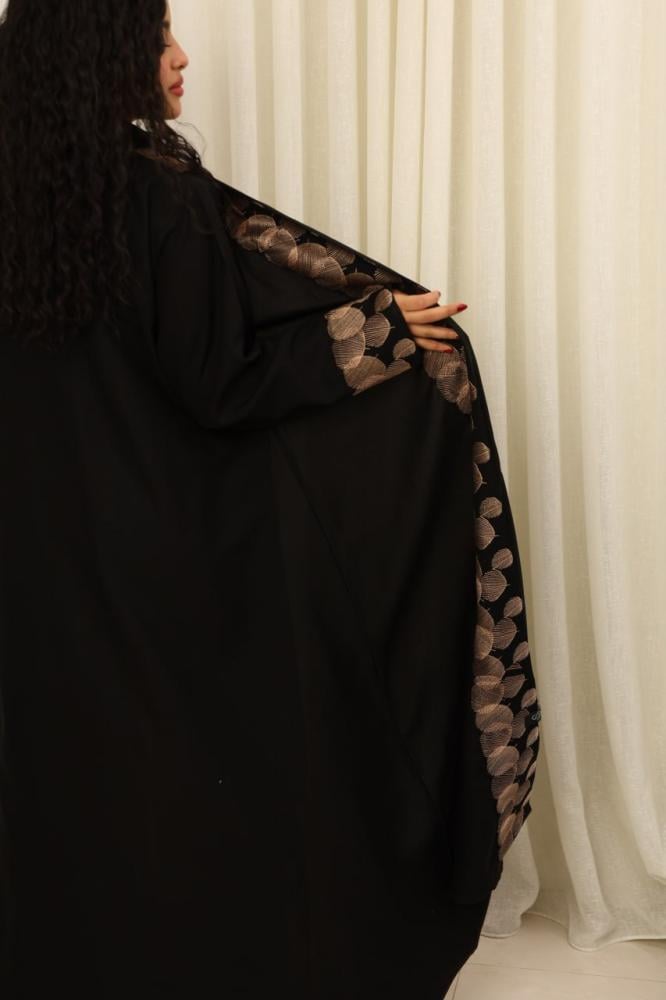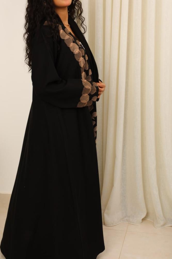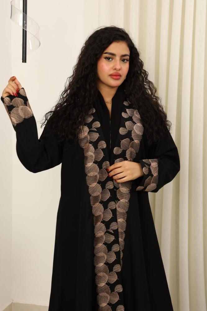ارتقي بإطلالتك هذا الموسم مع هذه العباية المصنوعة من كتانٍ عالي الجودة يوازن بين الخفّة والعملية، لتنعمي ببرودة القماش طوال اليوم دون التضحية بالأناقة. تتميز بقصّة نصف كلوش تمنحك اتساعًا أنيقًا وانسيابية مريحة مع كل خطوة. يزدان كامل خطّ الواجهة وأطراف الأكمام بتطريز أوراق دائرية بلون ذهبي-بيج يمنح العباية لمسة فاخرة تلفت الأنظار دون مبالغة.
